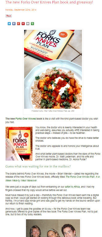And now, I get to pass the goodies on to you - for the ForksOver Knives team has generously offered to give copies of the new book The Forks Over Knives Plan, not to just one, but to two of my lucky readers.