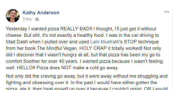 How to conquer cravings is a common question.  Because I had the same question for so many years I've addressed this topic on multiple occasions. This week, reader Kathy came forward with her life-changing experience of implementing simple strategies from The Mindful Vegan book as an effective, previously unexplored way to navigate and dissolve cravings.  I write about ending the craving cycle extensively in The Mindful Vegan.  But there's nothing quite like someone coming forward, as Kathy has, and sharing their extraordinary experience with the tools you find in the book. You'll find Kathy's report on the blog here: How Kathy Took Control of Pizza Cravings Using the S.T.O.P. Strategy From The Mindful Vegan Book